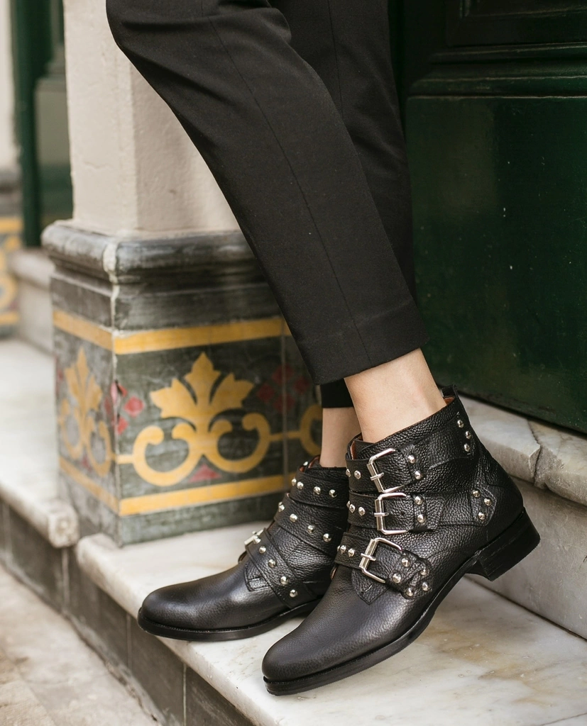 Bota confeccionada en cuero y suela, con taco de 3 cm de alto. Con tachas y hebillas metálicas.